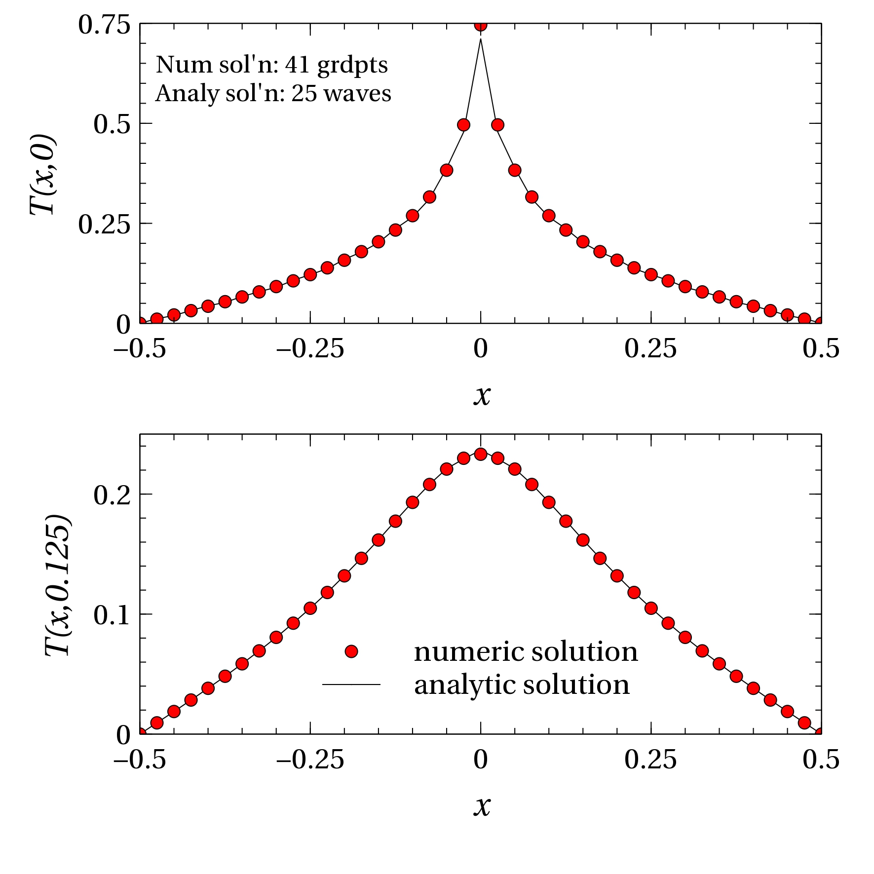 - Instructor's solutions for lab 2: (a) using Matlab, a 3D view and a slice through y=0; and (b) using Fortran 90, slices at y=0 and y=1/8 (plotted using the free software Veusz). As the number of terms included in the analytical solution increaes to infinity, ever shorter waves (higher wavenumbers) contribute and the analytic solution captures the "peakiness" of the delta function. In the numeric solution, the equivalent progression towards the true solution is made by refining the resolution (reducing the gridlength Δ), so that the heat source, ideally a delta function (if seen in cross section through y=0, is represented by an increasingly narrow (but higher) triangle (always preserving unit area).