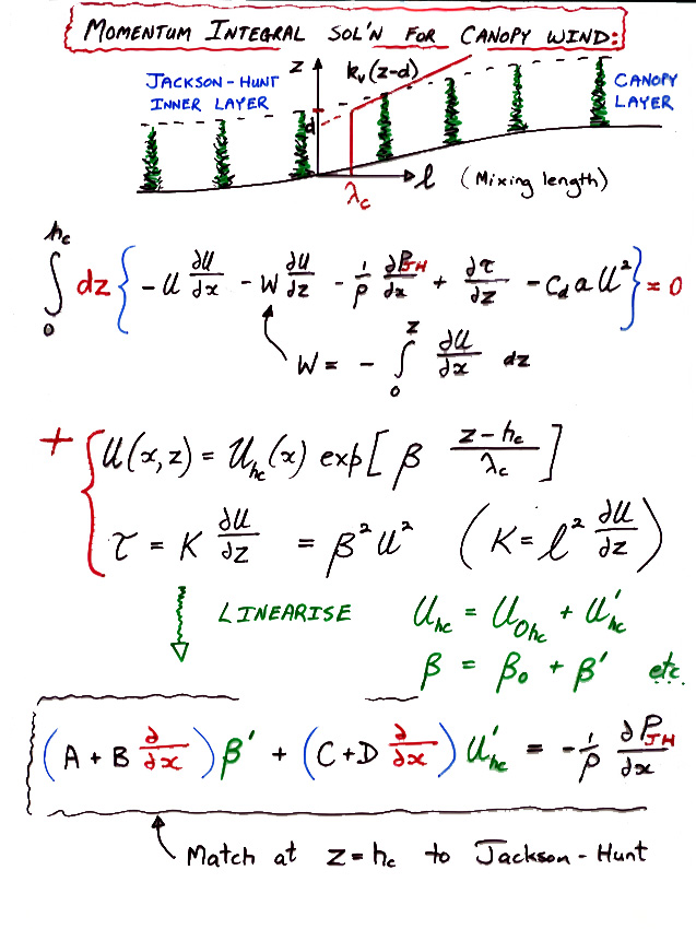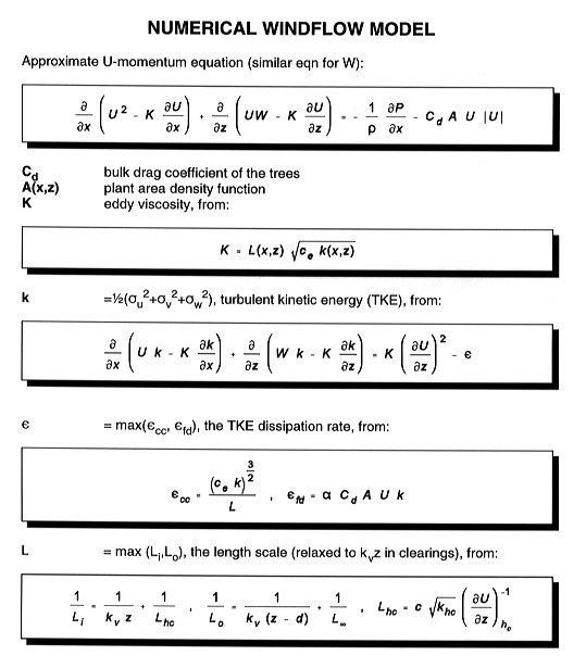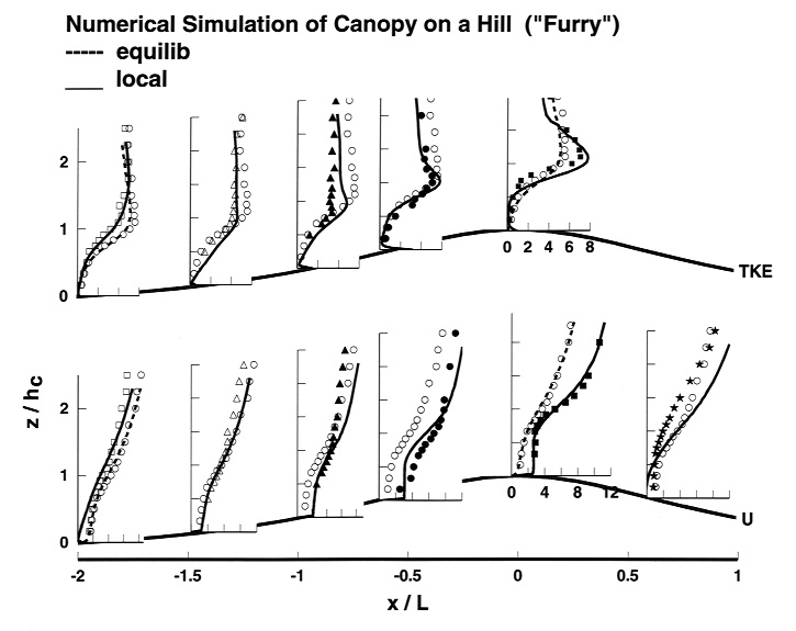 where l=l(x,z) is an imposed lengthscale, and k is the "turbulent kinetic energy," calculated from the TKE equation. Solutions were "driven" by an imposed (measured; or theoretical, JH) pressure gradient, in order to simulate a hill flow: