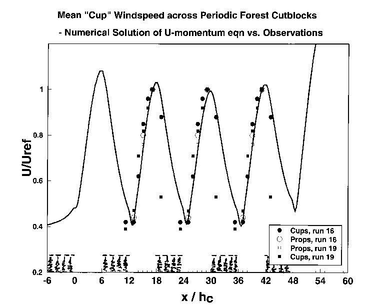The numerical model matches quite well the observed variation in the mean wind across the clearing, (and incidentally, predicts that had we measured the wind in adjacent clearings of this periodic forest-block/clear block matrix, we would have seen virtually the same pattern). Simulated TKE also agreed reasonably well with the observed variation.