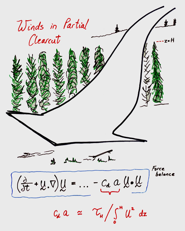 In conjunction with this experiment, and in the hope of providing a theoretical basis on which to interpret the observed pattern of tree blowdown, we (Dr Tom Flesch, myself) placed towers traversing protected cutblocks; we studied two cases